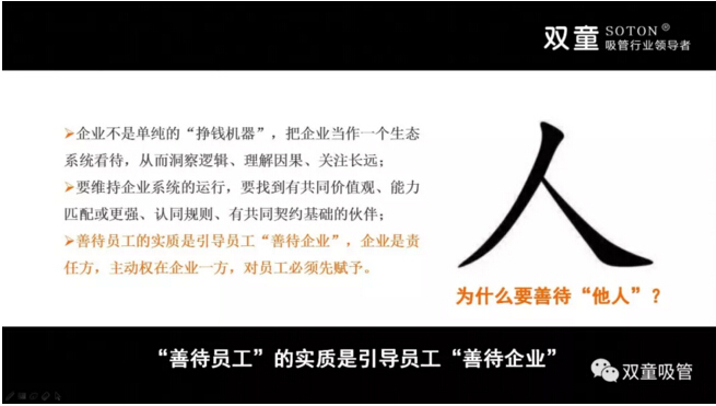 同時,樓總也引導同學們透過現(xiàn)象看本質(zhì),“雙童”之所以15年前建設節(jié)能降耗系統(tǒng),消滅所有的污染排放是因為“雙童”看的很遠,用“利他”去獲得“利已”!
