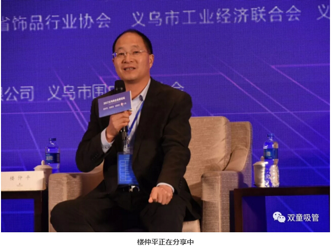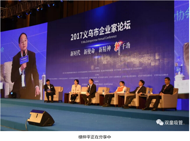 在最受矚目的企業(yè)家分享環(huán)節(jié),“雙童”樓仲平與義烏新光控股集團(tuán)董事長周曉光、義烏浪莎襪業(yè)有限公司董事長翁榮金、義烏華鴻控股集團(tuán)有限公司董事長龔品忠、義烏小微企業(yè)代表黃洪鳴這幾位義烏企業(yè)界大咖被邀上臺,共同分享了他們的2017年收獲以及2018年的展望!