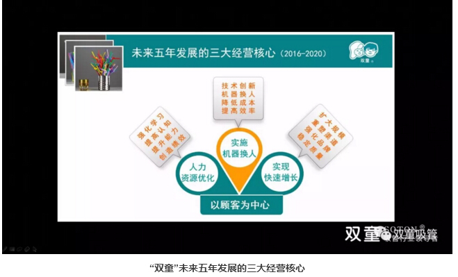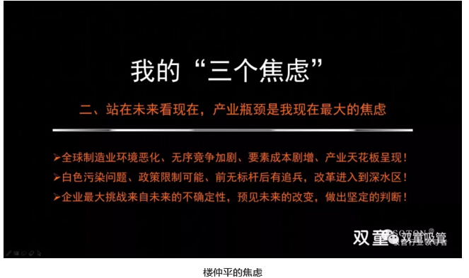 “同時(shí),在這個(gè)高度變化的時(shí)代,企業(yè)最大挑戰(zhàn)來(lái)自未來(lái)的不確定性,制造業(yè)從1.0到4.0,‘雙童’離‘天花板’瓶頸也越來(lái)越近,這就是我們的焦慮。作為創(chuàng)業(yè)者來(lái)說(shuō),我要真正理解企業(yè)家精神,理解創(chuàng)業(yè)者需要思考的下一個(gè)維度,從而遇見(jiàn)未來(lái)的改變,做出堅(jiān)定的判斷。”