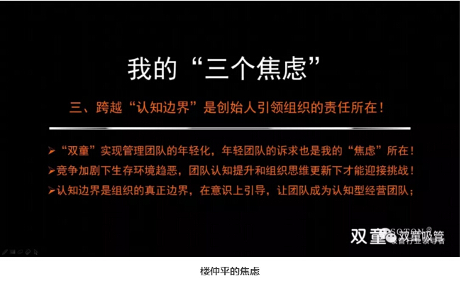 樓仲平分享了自己的第三個(gè)焦慮:2011年,“雙童”明確“再造經(jīng)理人”計(jì)劃,選拔培養(yǎng)年輕領(lǐng)導(dǎo)層,管理團(tuán)隊(duì)更加年輕化,“雙童”管理團(tuán)隊(duì)也更加年輕、有斗志,有激情。但當(dāng)我看到這批年輕的管理團(tuán)隊(duì)臉上洋溢著對(duì)未來(lái)的期待、渴求和夢(mèng)想的時(shí)候,我明白他們現(xiàn)在正“嗷嗷待哺”,我需要給他們創(chuàng)造更大的空間和更廣闊的平臺(tái),我產(chǎn)生了無(wú)限的壓力和焦慮。我要思考如何創(chuàng)造空間,讓他們實(shí)現(xiàn)更大的夢(mèng)想,我不能讓我的邊界限制企業(yè)的未來(lái)十年,不能讓我的邊界限制年輕有為的管理團(tuán)隊(duì)!