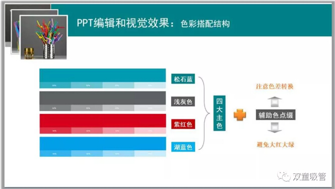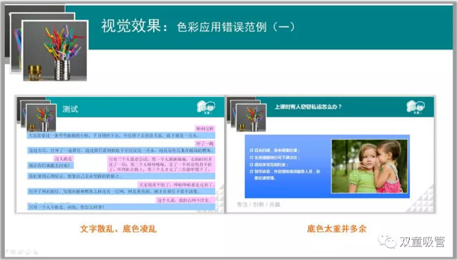 想要制作一個美觀的PPT,色彩的搭配也尤其重要!樓仲平也分享了色彩搭配的相近原則、色彩點綴的相對原則等技巧,下面就通過圖片來看看色彩的搭配和一些錯誤的案例吧!