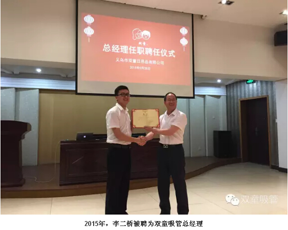 2015年5月28日,“雙童”舉辦了簡單而正式的總經(jīng)理任命儀式。在任命儀式上,樓仲平對李二橋中肯評價:“我對主要崗位的用人較為苛求,尤其對可能是以后的接班人,我的要求更為嚴格。雖然李二橋文化程度不高,但為人正派,做事認真。他從基層做起,在‘雙童’一待就是16年。他經(jīng)歷上下起伏,歷經(jīng)考驗、磨練,成為了如今拿得起、放得下、看得遠的‘將軍’。