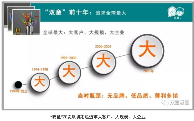 因此,“雙童”在最初的10年,正是沿著這樣的思路,以量取勝,不斷擴(kuò)大規(guī)模,以規(guī)模換效益,追求大客戶,喜歡大訂單,成為了吸管行業(yè)的巨頭。樓仲平坦言:當(dāng)時的大客戶往往一個單子就是幾十個貨柜,接下來后公司 3-5個月需要專注做它的單子,無暇應(yīng)接別的中小客戶,不用滿世界去找訂單做。