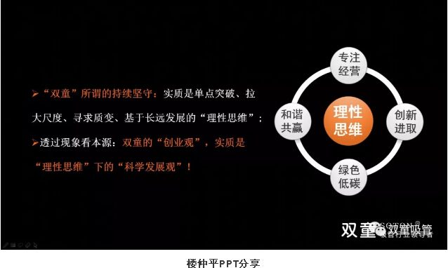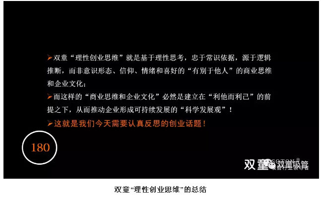 最后,樓仲平也對(duì)雙童“理性創(chuàng)業(yè)思維”進(jìn)行了總結(jié):它就是基于理性思考,忠于常識(shí)依據(jù),源于邏輯推斷,而非意識(shí)形態(tài)、信仰、情緒和喜好的“有別于他人”的商業(yè)思維和企業(yè)文化;而這樣的“商業(yè)思維和企業(yè)文化”必然是建立在“利他而利己”的前提之下,從而推動(dòng)企業(yè)形成可持續(xù)發(fā)展的“科學(xué)發(fā)展觀”!