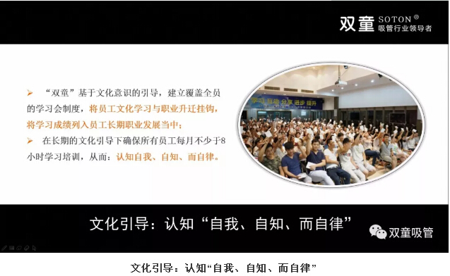 從企業(yè)經(jīng)營的角度來說,“雙童”就極為重視“文化載體”的維護(hù)和調(diào)整,建立了以“價(jià)值觀傳播”、“閃亮點(diǎn)傳播”、“自媒體傳播”的文化傳播體系。如:“雙童”基于文化意識(shí)的引導(dǎo),建立覆蓋全員的學(xué)習(xí)會(huì)制度。在長期的文化引導(dǎo)下確保所有員工每月不少于8小時(shí)學(xué)習(xí)培訓(xùn),從而引導(dǎo)員工們認(rèn)知自我、自知、而達(dá)到自律。