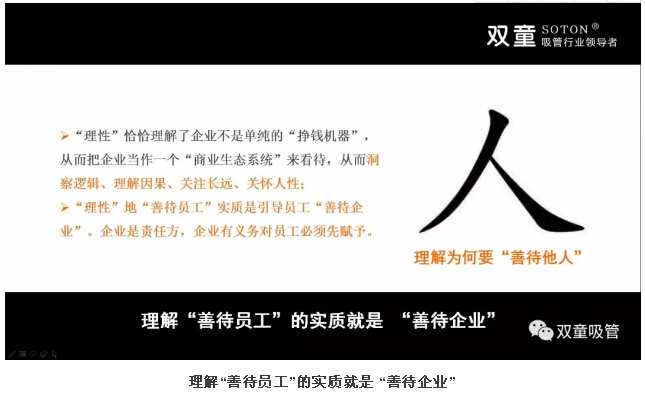 需要注意的是,所謂的“理性經(jīng)營”絕非是不講情理,更非冷血?jiǎng)游铩袄硇浴标P(guān)注的是“人性”所需,“雙童”建立以“人”和“家”為中心的人性化管理模式,“理性”地“善待員工”,實(shí)質(zhì)是引導(dǎo)員工“善待企業(yè)”。