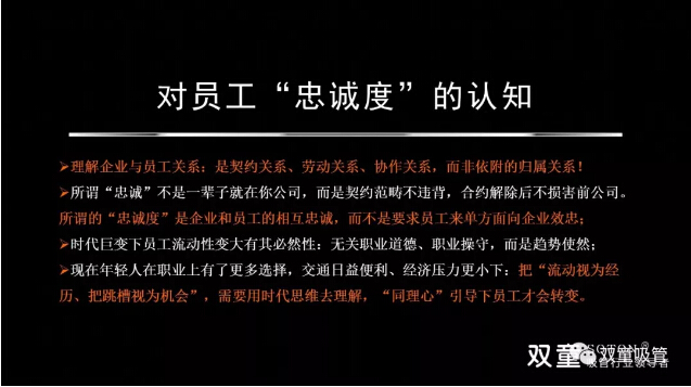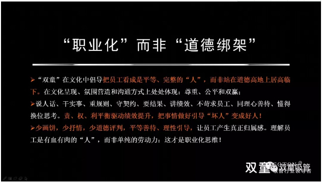 在“理性”思維的持續(xù)引導(dǎo)下,“雙童”在文化中倡導(dǎo)把員工看成是平等、完整的“人”,而非站在道德高地上居高臨下。在“雙童”的文化呈現(xiàn)、氛圍營造和溝通方式上,處處體現(xiàn)了“理性”思維,通過愿景展現(xiàn)、目標(biāo)設(shè)立、規(guī)則訂立和激勵(lì)兌現(xiàn),引導(dǎo)員工將“組織目標(biāo)”轉(zhuǎn)化成“個(gè)人目標(biāo)”,逐步實(shí)現(xiàn)“事物性引導(dǎo)”來改變團(tuán)隊(duì)的價(jià)值觀。所以,管理不是管控、教條和賦予,而是激發(fā)和釋放每個(gè)人的善意,幫助員工成長、激發(fā)其創(chuàng)造,在共同追求中形成一致的價(jià)值和理念認(rèn)同。