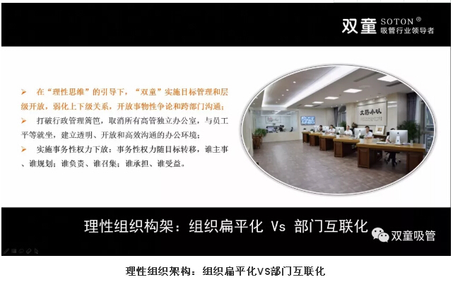 在“理性思維”的持續(xù)引導(dǎo)下,“雙童”實(shí)施目標(biāo)管理和層級(jí)開放,弱化上下級(jí)關(guān)系,開放事務(wù)性爭論和跨部門溝通;打破行政管理籬笆,取消所有高管獨(dú)立辦公室,與員工平等就坐,建立透明、開放和高效溝通的辦公環(huán)境;實(shí)施事務(wù)性權(quán)力隨目標(biāo)轉(zhuǎn)移,誰主事、誰規(guī)劃;誰負(fù)責(zé)、誰召集;誰承擔(dān)、誰受益。
