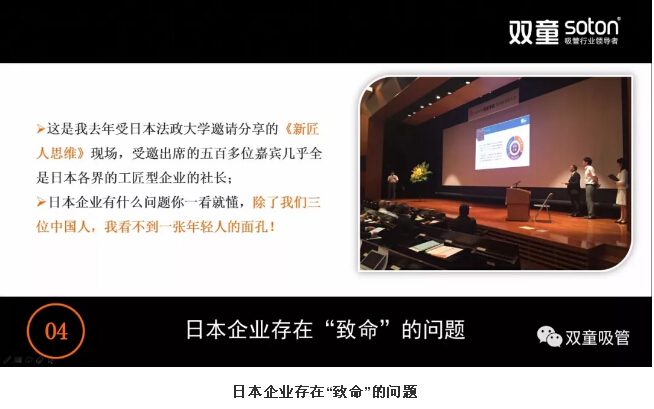 首先,“雙童”樓仲平分享了日本奈良“一次性筷子工廠”的故事及日本企業(yè)存在的“致命”問(wèn)題。如今,日本推崇極致“工匠精神”的企業(yè)被逐漸淘汰。另外,極致的“工匠精神”也讓日本年輕人不愿意接班,經(jīng)營(yíng)層老齡化成為日本中小企業(yè)的突出特征!