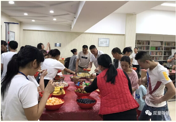 “比比誰更快?”可是團(tuán)隊游戲哦,考驗的是大家的默契程度!瞧,第一位出戰(zhàn)者剛運(yùn)送完乒乓球,第二位就開始吃西瓜、第三位馬上用眼鏡吸管喝飲料啦…… 最快的團(tuán)隊僅僅用了兩分鐘就完成了游戲,大家真是默契十足呀!
