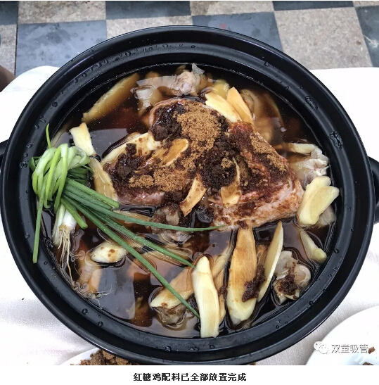 這道菜做起來(lái)可不簡(jiǎn)單哦!除了有雞、紅糖、豬腳等主料外,還需加入七種調(diào)料,經(jīng)過(guò)12道工序后,用土鍋柴火燒制,并用稻草灰蓋鍋密封才能烹飪出更好的味道。 經(jīng)過(guò)大半天的燒制,“義烏紅糖雞”大功告成,色香味俱全!(PS:嫩雞至少要燉1個(gè)小時(shí),老母雞至少要燉2—3個(gè)小時(shí))
