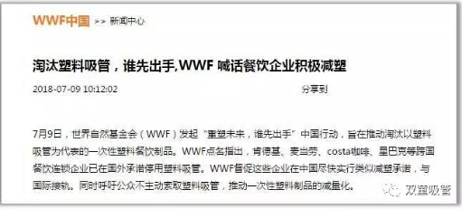7月9日,世界自然基金會(huì)(WWF)發(fā)起“重塑未來(lái),誰(shuí)先出手”中國(guó)行動(dòng),旨在推動(dòng)淘汰以塑料吸管為代表的一次性塑料餐飲制品。