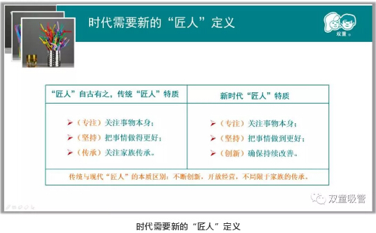 由此我提出,真正適合國(guó)內(nèi)企業(yè)的“工匠精神”,必須在前面加上一個(gè)“新”字。這個(gè)“新”,就意味著加入時(shí)代巨變的元素,加入“互聯(lián)網(wǎng)信息化高度對(duì)稱”的元素。