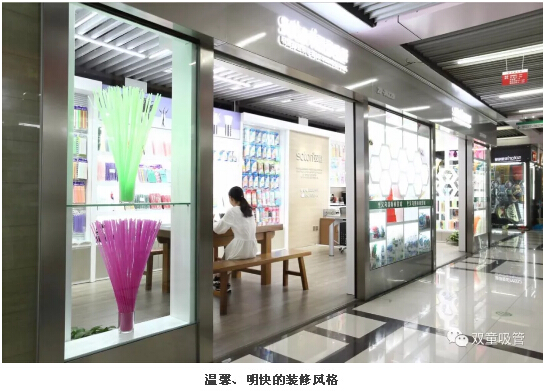 走進“雙童”商鋪,琳瑯滿目的吸管在明亮燈光的照耀下顯得尤為精致,細膩、溫馨、明快、簡約的裝修風格則給了客戶更好的視覺體驗,現代感十足!