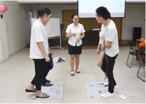 趁熱打鐵!第二個(gè)小游戲—“勝者為王”也登場啦!所有配對的男神女神們分為AB兩組,兩位男女隊(duì)員單腳站在報(bào)紙上,兩組面對,派代表進(jìn)行劃拳,失敗者將自己的報(bào)紙對折,再繼續(xù)游戲,直到游戲者單腳無法站立報(bào)紙上或腳離開自己的報(bào)紙,游戲結(jié)束。通過小游戲的開展,單身男女們真是“親密無間”呀!
