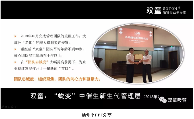 據(jù)悉,現(xiàn)在公司有二三十個(gè)中高層,平均工齡10年以上,年齡30歲左右,都是樓先生一個(gè)個(gè)帶出來(lái)的,雙童”做的吸管是一個(gè)比較偏門的行業(yè),沒(méi)有行業(yè)的通用性人才。