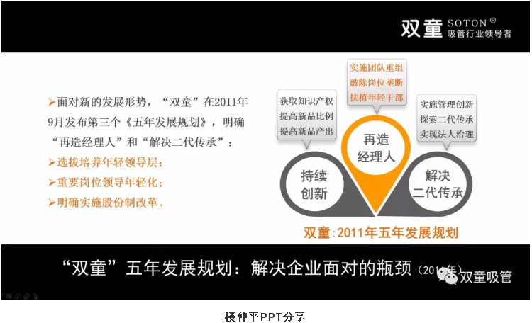 樓仲平早在5年前就想到了這個(gè)問(wèn)題,并發(fā)表了第二個(gè)“五年發(fā)展規(guī)劃”,其中提到了3個(gè)關(guān)鍵詞“持續(xù)創(chuàng)新,再造經(jīng)理人,解決二代傳承?!?/span>