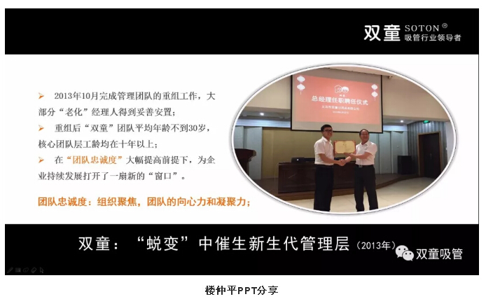 現(xiàn)在,公司有二三十個(gè)中高層,平均工齡10年以上,年齡30歲左右,都是我一個(gè)個(gè)帶出來的,“雙童”做的吸管是一個(gè)比較偏門的行業(yè),沒有行業(yè)的通用性人才,所以我們基本不用空降兵。這批人是我?guī)С鰜淼?,就深受我的影響,在乎工作、可以放下身段,整體素質(zhì)遠(yuǎn)超第一代管理者。這批第二代管理者培養(yǎng)起來后,至少打開了“雙童”未來二十多年企業(yè)持續(xù)發(fā)展的窗口。