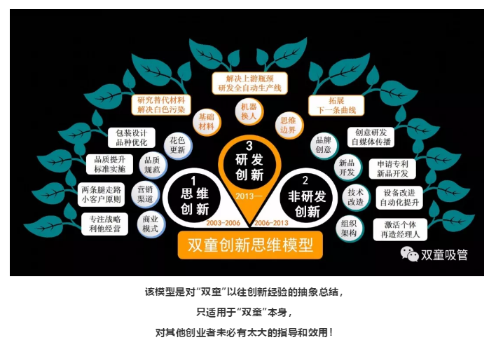 2003年開(kāi)始,“雙童”提出了“兩條腿走路戰(zhàn)略”和“小客戶原則”,走差異化轉(zhuǎn)型路線,進(jìn)行思維創(chuàng)新。同時(shí),“雙童”通過(guò)技術(shù)改造、新品開(kāi)發(fā)、品牌創(chuàng)意等開(kāi)展非研發(fā)創(chuàng)新工作,通過(guò)打開(kāi)思維邊界、機(jī)器換人、研發(fā)可降解產(chǎn)品等開(kāi)展研發(fā)創(chuàng)新,從而促進(jìn)和推動(dòng)企業(yè)的發(fā)展!