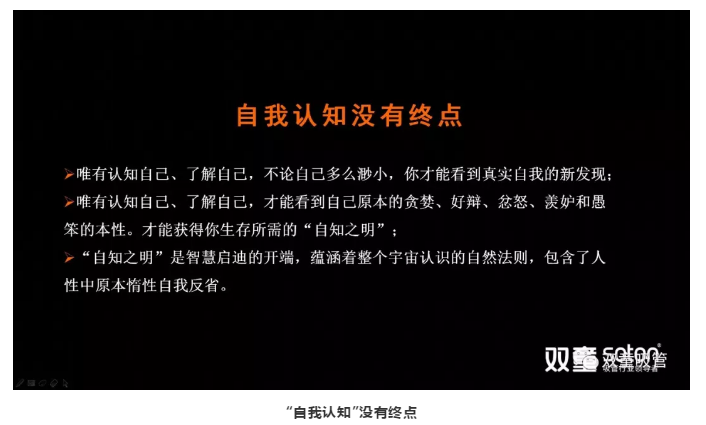 原來,這是“雙童”第256期—259期行政學(xué)習(xí)會(huì)?!半p童”樓仲平連續(xù)四天圍繞“人性的基礎(chǔ)認(rèn)知”、“人性的十三個(gè)特征”、“理性與感性思維”三大板塊進(jìn)行分享,引導(dǎo)員工們認(rèn)知“人性”和“哲科思維”。