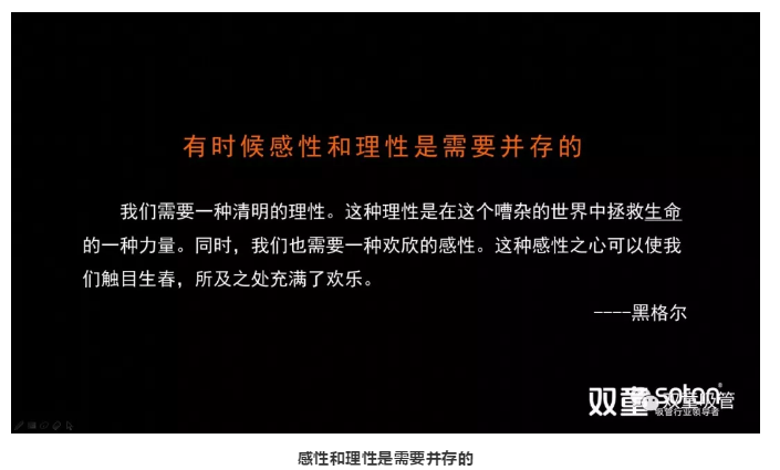 通過中西方文化的對(duì)比,我們可以發(fā)現(xiàn):我們不能只有“感性思維”,但也不能一味的倡導(dǎo)西方的“理性思維”。唯有“以中為體、以西為用”,將感性思維和理性思維相融合,才能更好地平衡工作和生活!最后,樓仲平也巧妙的用黑格爾的名言分享了感性和理性是需要并存的。