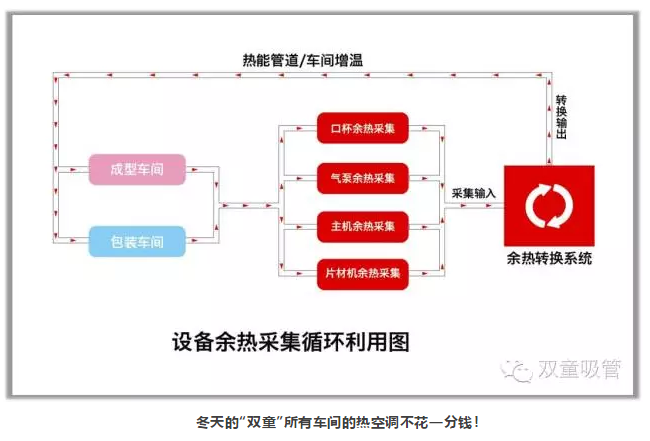 考慮到“雙童”生產(chǎn)設(shè)備產(chǎn)生大量余熱的狀況,我們?cè)谒械脑O(shè)備上安裝了余熱采集裝置,把所有生產(chǎn)設(shè)備的余熱和廢氣進(jìn)行采集并回收,采集的余熱經(jīng)過凈化處理后再通過管道供應(yīng)給所有車間進(jìn)行二次能源的利用(原來需要的熱空調(diào)現(xiàn)在不用了,節(jié)能了大量的電費(fèi))!