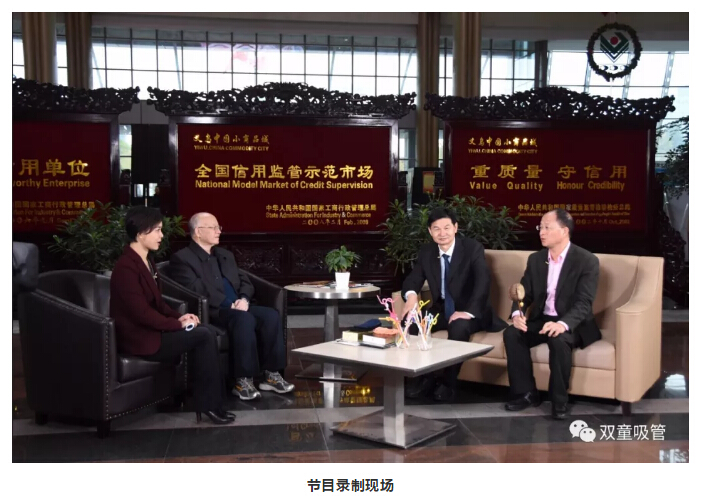 12月6日,金華電視臺改革開放40周年專題節(jié)目“騰飛”篇章在義烏國際商貿(mào)城四區(qū)錄制。“雙童”樓仲平受邀與主持人賀爭怡、浙江師范大學(xué)經(jīng)濟(jì)與管理學(xué)院院長陸立軍教授、浪莎集團(tuán)總裁翁榮弟先生同臺親密互動。