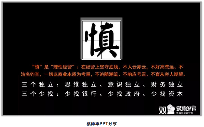 “慎”也是科學(xué)管理的本真,我們要有自己獨(dú)立的意識,要有自己獨(dú)立的思維,在經(jīng)營上要有自己的獨(dú)立判斷,堅(jiān)守底線,不人云亦云,一切以商業(yè)本質(zhì)為考量,不追隨潮流、不響應(yīng)號召、不盲從旁人期望?;谝陨?,樓仲平也總結(jié)出“三個(gè)獨(dú)立”和“三個(gè)少找”: