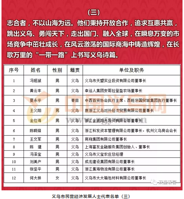 同時,此次大會還對以下的義烏市民營經(jīng)濟發(fā)展代表人士進行了頒獎表彰!