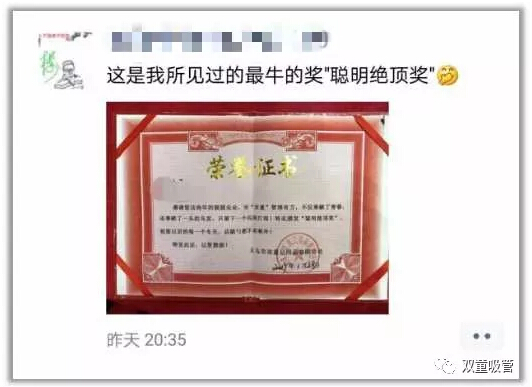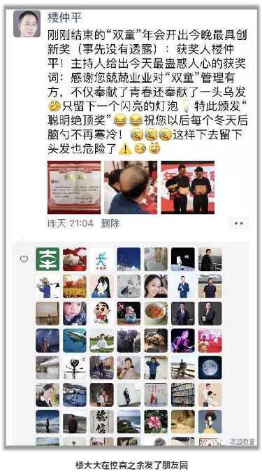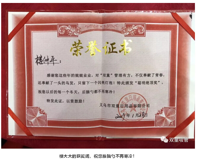 榮譽(yù)證書:樓仲平,感謝您這些年的兢兢業(yè)業(yè),對(duì)“雙童”管理有方,不僅奉獻(xiàn)了青春,還奉獻(xiàn)了一頭的烏發(fā),只留下一個(gè)閃亮的燈泡!特此頒發(fā)“聰明絕頂獎(jiǎng)”,祝您以后的每一個(gè)冬天,后腦勺不再寒冷!