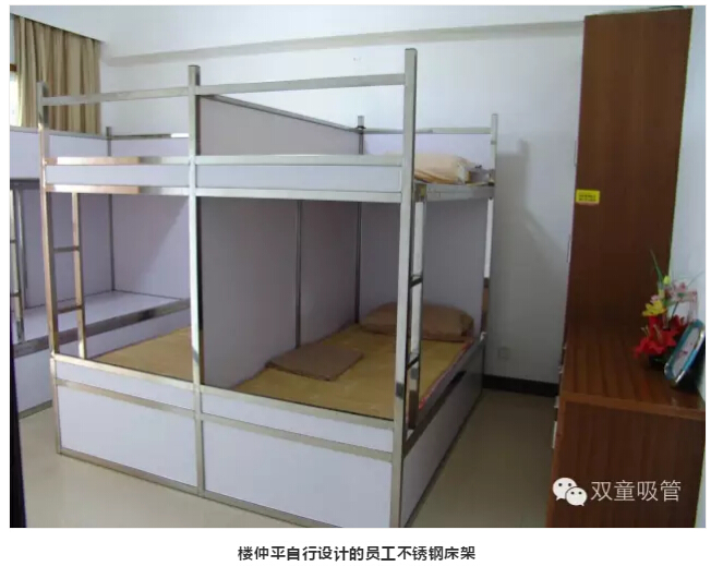 “雙童”員工集體寢室的不銹鋼床架可是參觀團(tuán)隊(duì)最津津樂道的話題之一!這些床架都是由“雙童”樓仲平自行設(shè)計(jì),在建造之初就把床架焊在地上。這樣一來,即避免產(chǎn)生垃圾死角,床下又多了一個(gè)封閉的儲(chǔ)物空間,確保員工在生活方面的便利舒適!