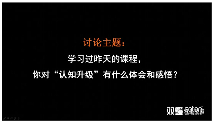 在聽完傅盛老師的課程之后,大家圍繞“你對‘認知’升級”有什么體會和感悟”進行分組討論,每位組員都要提煉表達出自己的觀點,各小組進行總結(jié)后輪流進行分享。