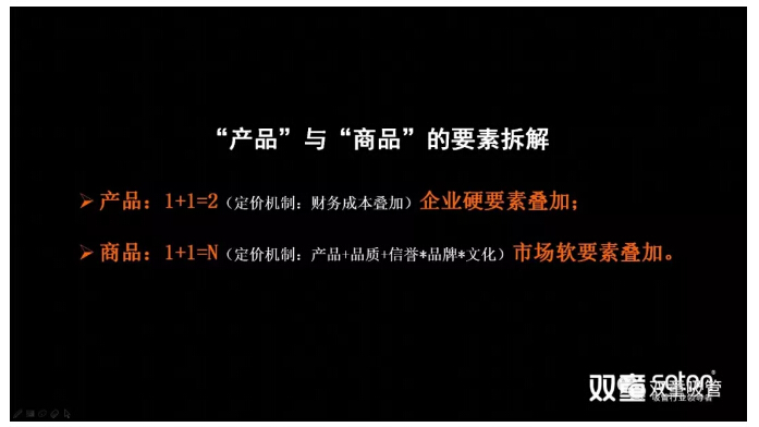 但商品是將產(chǎn)品、品質(zhì)、品牌、文化等市場軟要素疊加,1+1=N。在產(chǎn)品本身內(nèi)核不發(fā)生改變的情況下,產(chǎn)品之外的文化性、精神性、趣味性、情感性等屬性不斷地外延,通過“創(chuàng)始人”、“團隊員工”、“價值觀”、“超鏈接”等又形成了產(chǎn)品的種種不同屬性。