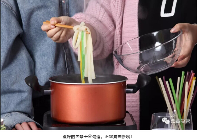 用“雙童”可食用淀粉吸管煮面條,不論是湯面、醬面還是拌面,那味道都是杠杠滴!連懷孕了的吸管妞和年幼的小朋友都能放心享用哦!
