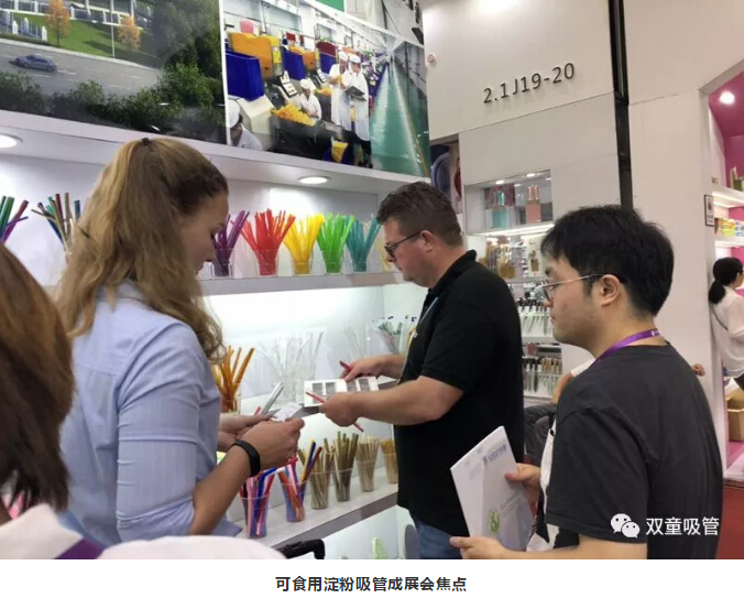 瞧!“雙童”展區(qū)展示著各式各樣的可食用淀粉吸管,它們成為了此次展會(huì)的焦點(diǎn),大批新老客商駐足詢價(jià),現(xiàn)場真是擠爆啦!