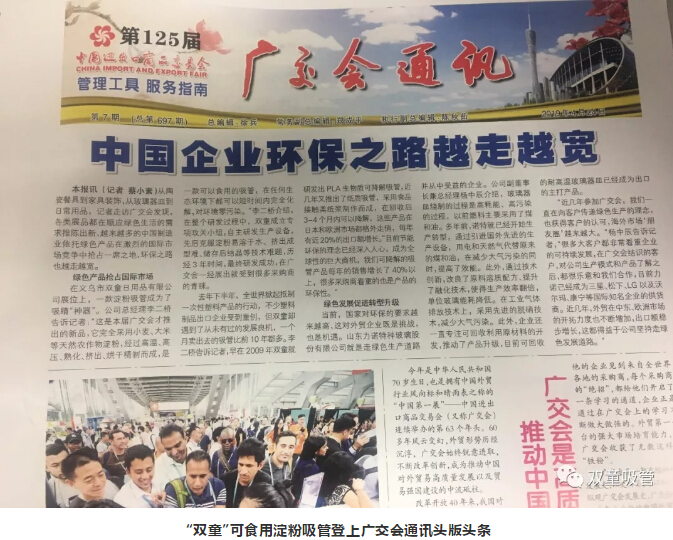 “雙童”可食用淀粉吸管除了吸引了大批客商之外,也引起了媒體朋友們的關(guān)注?!半p童”可食用淀粉吸管作為中國企業(yè)環(huán)保案例登上了廣交會(huì)通訊報(bào)的頭版頭條,在廣交會(huì)上一炮打響!