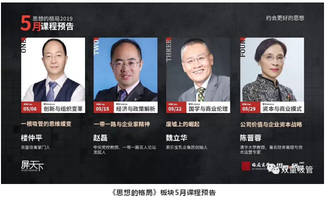 如果你沒有聽夠我和我父親的故事,請于5月8日來格局商學,這是一家覆蓋全球50000位企業(yè)主的管理教育平臺,我父親將在格局商學最核心的板塊《思想的格局2019》分享《一根吸管的思維蝶變》課程,引導大家突破表象認知,理解底層邏輯,用互聯(lián)網(wǎng)的思維去理解產(chǎn)品!
