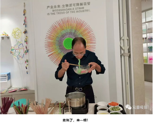 瞧!樓仲平開啟煮吸管模式啦!他向記者介紹:雙童”可食用淀粉吸管完全采用小麥、大米、玉米、木薯、土豆等天然農(nóng)作物淀粉,經(jīng)高溫、高壓、熟化、擠出、烘干精制而成!最重要的是,它可以短時間內(nèi)在任何生態(tài)環(huán)境下完全自然化解。
