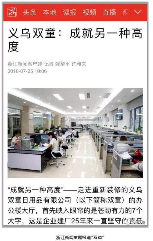 “成就另一種高度”——走進重新裝修的義烏雙童日用品有限公司(以下簡稱“雙童”)的辦公樓大廳,首先映入眼簾的是蒼勁有力的7個大字,這是企業(yè)建廠25年來一直堅守的責(zé)任和使命。