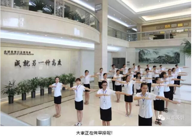 除了精神上要得到提升之外,我們的身體素質(zhì)也非常重要!每天,在晨讀環(huán)節(jié)結(jié)束之后,我們都會進行早操活動。俗話說,“一年之際在于春,一天之際在于晨”。在“雙童”行政大廳,員工們列隊整齊,精神飽滿,氣宇軒昂,伴著豪邁的音樂,用整齊劃一的動作做起早操,形成了一道靚麗的風(fēng)景線。