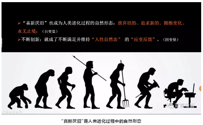 人類作為生物進化的物種,其屬性遵循自然規(guī)律,本性就是“喜新厭舊”的。因此,不斷創(chuàng)新就成了不斷滿足并維持“人性自然態(tài)” 的“應變反饋”。