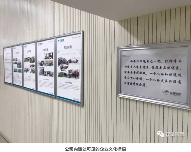 原來,在“雙童”行政樓的墻上,到處都掛著一幅幅精致的鏡框,而鏡框里的內(nèi)容,就是能夠體現(xiàn)“雙童”核心文化價(jià)值觀的文化標(biāo)語(yǔ)!
