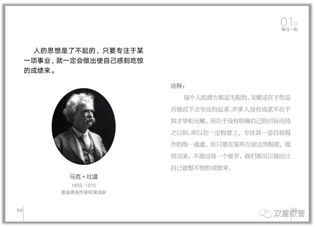 這些文化標(biāo)語(yǔ),可不是隨便找來掛一掛的哦!它們都是從幾千句名人名言、經(jīng)典好書中擇取篩選出來,并經(jīng)過我們的詳細(xì)注釋,成為“雙童”企業(yè)文化的一部分!