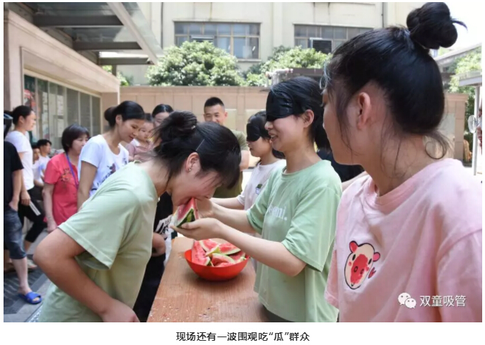 游戲的第一項就是“蒙眼吃西瓜”!聽到吃,大家的眼睛都亮了,笑說:吃西瓜,太簡單了!真的像大家說的很簡單嗎?快跟著妞來看看吧!