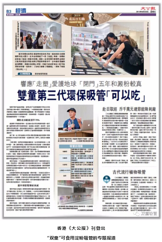 近日,香港《大公報》刊登出了《“雙童”第三代環(huán)保吸管“可以吃”》的專題報道,究竟小記者們在“雙童”發(fā)現(xiàn)了哪些精彩亮點(diǎn)呢?快跟著吸管妞一起來看看吧!