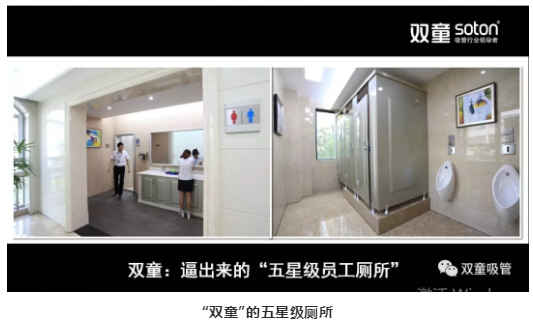 受此影響,2003年“雙童”在建設廠房后,就將所有公共洗手間全部按“五星級”的標準進行裝修。因為,一個企業(yè)的洗手間最能體現(xiàn)企業(yè)的經(jīng)營理念,所以要生產(chǎn)出優(yōu)質(zhì)的產(chǎn)品,洗手間就應該是企業(yè)最干凈的地方。