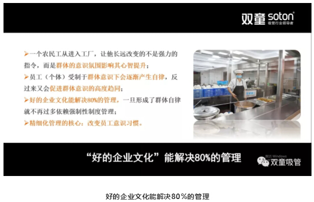 由此,我們認知到:質(zhì)量的改善僅有硬件和制度是不夠的,更需要不斷提升每一位員工的素養(yǎng),形成高度統(tǒng)一的群體意識 。自此,“雙童”質(zhì)量文化開始逐步完善,通過硬件環(huán)境和文化氛圍潛移默化地影響員工,用精細化管理的方式改變員工的意識和習慣。