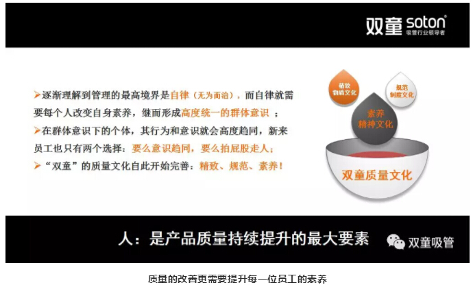 通過對環(huán)境和制度的不斷改善,我們認知到:質(zhì)量的改善僅有硬件和制度是不夠的,更需要不斷提升每一位員工的素養(yǎng),形成高度統(tǒng)一的群體意識 。自此,“雙童”質(zhì)量文化開始逐步完善,通過硬件環(huán)境和文化氛圍潛移默化地影響員工,用精細化管理的方式改變員工的意識和習(xí)慣。