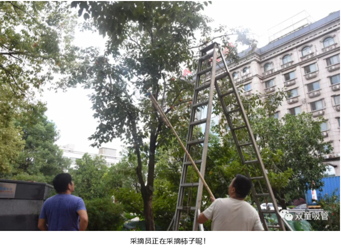 梯子、箱子皆已就位,采摘開始!瞧!采摘員身輕如燕,一下就登上了梯子,瞬間就被金燦燦的柿子們“包圍啦”!