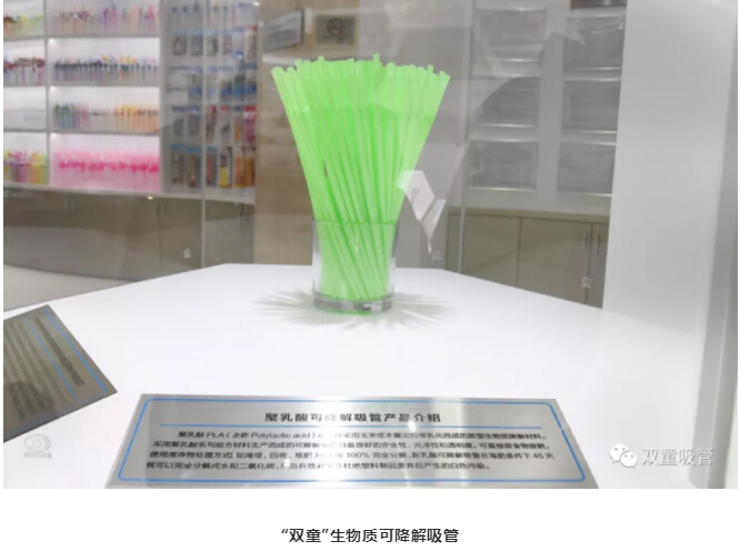 緊接著,來到可降解吸管展示區(qū)時(shí),"雙童"樓仲平先向大家介紹了45天就可以化解成水和二氧化碳的“雙童”PLA生物質(zhì)可降解吸管。